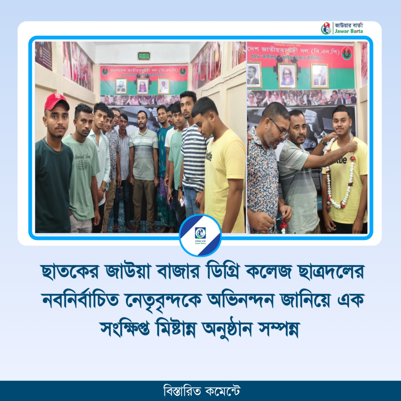 ছাতকের জাউয়া বাজার ডিগ্রি কলেজ ছাত্রদলের নবনির্বাচিত নেতৃবৃন্দকে অভিনন্দন জানিয়ে এক সংক্ষিপ্ত মিষ্টান্ন অনুষ্ঠানের আয়োজন করা হয়।